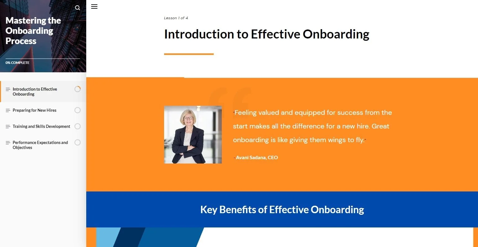 This course is tailored for new employees to help acquaint them with the organization's policies and processes. Participants will delve into essential responsibilities such as process design, feedback collection, implementation oversight, and effective communication strategies. Leveraging Articulate Rise, this course was created to allow participants to explore practical techniques and tools specifically designed to enhance the onboarding experience within their organizations. Whether you're aiming to refine existing procedures or implement new strategies, this course equips you with the knowledge and skills necessary to elevate your onboarding practices to new heights.